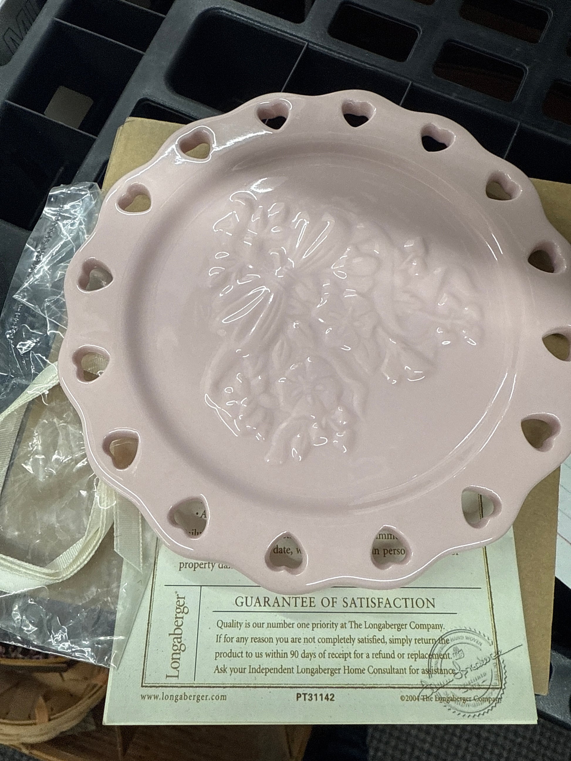 Longaberger sweetest heart candle plate in pink with ivory ribbon